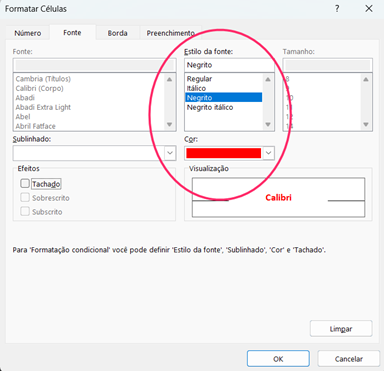 - Na guia Fonte selecione cor Vermelho e Negrito.