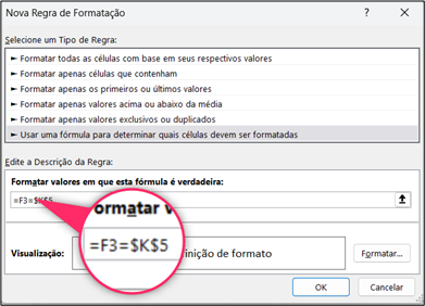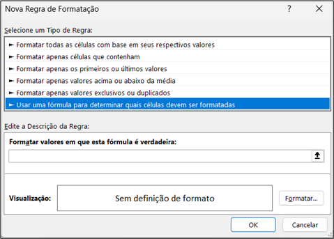 - Selecione a ferramenta Formatação Condicional, Nova Regra e, na janela apresentada, selecione Usar uma fórmula para determinar quais células devem ser formatadas.