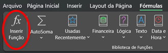 Até agora, sempre digitamos a função diretamente dentro da célula. No entanto, podemos utilizar a ferramenta Inserir Função que irá guiar, passo a passo, a construção da função na célula. Essa ferramenta é útil quando não sabemos exatamente qual função devemos utilizar naquele momento, pois permite escolher entre os vários tipos a mais adequada à situação.
