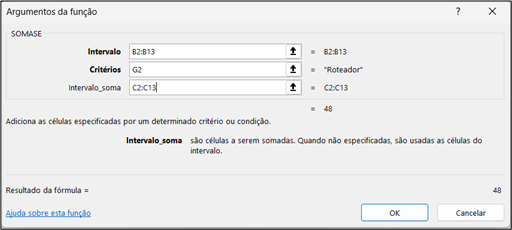 - Por fim você vai indicar qual é o intervalo de células que devem ser somadas. Selecione a região C2:C13. Após informar todos os argumentos, você terá: