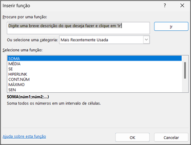 Nessa janela podemos procurar pela função, selecionar uma categoria, selecionar a função. Veja que é mostrada uma breve descrição da função selecionada. No campo Procure por uma função digite SOMASE, clique no botão Ir e, a seguir, com a função SOMASE selecionada, clique em OK.