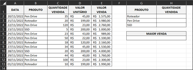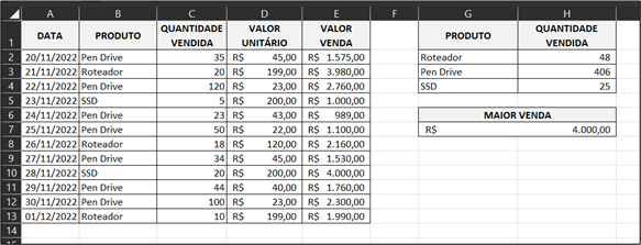 - Faça o mesmo procedimento para calcular as quantidades vendidas de Pen Drive e SSD, bem como para calcular a maior venda com a função MÁXIMO.
