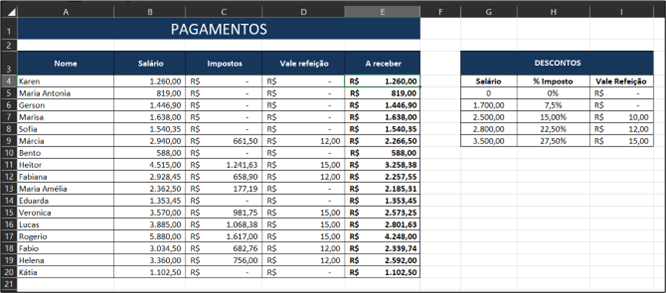 - O valor que será descontado para vale refeição também será obtido pela função PROCV. Na célula D4 digite a fórmula: