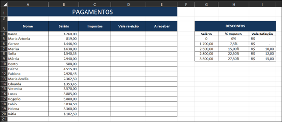 O objetivo da planilha é calcular quanto o funcionário tem para receber. Na tabela DESCONTOS temos o percentual de imposto e o valor para vale refeição que devem ser descontados de acordo com as faixas salariais na coluna Salário.