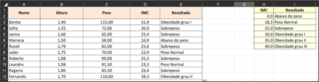 Veja que agora colocamos uma outra tabela IMC, mas de forma horizontal. Na segunda coluna Resultado, vamos mostrar as mensagens utilizando a função PROCH.