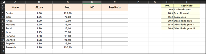 – valor_procurado: valor calculado do IMC da pessoa que, nesse caso, está na célula D3. Esse valor será procurado na primeira coluna da tabela de IMC.