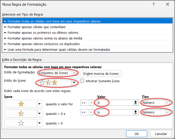 Veja que as estrelas estão indicando os valores de média >=8 (estrela preenchida), média < 8 e >= 6 (estrela preenchida pela metade) e média < 6 (estrela sem preenchimento.