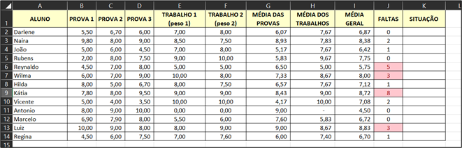 - Vamos utilizar mais um recurso da formatação condicional para exibir ícones na coluna média geral de acordo com os valores. Selecione a região I2:I14.