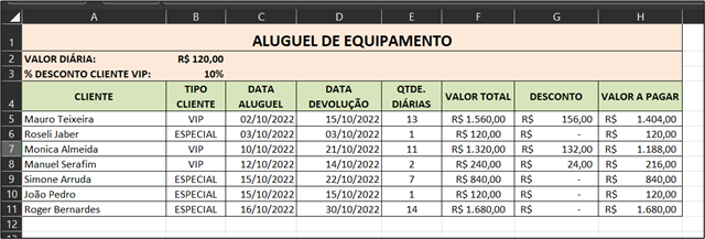 - Calcular o valor do desconto como sendo o valor total multiplicado pelo percentual de desconto. Devemos colocar uma condição nessa fórmula, pois somente os clientes VIP têm desconto.