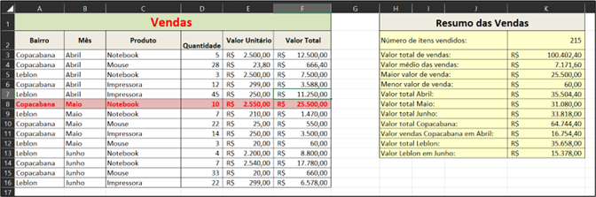 Vamos formatar a planilha para mostrar em vermelho o bairro que efetuou a maior venda.