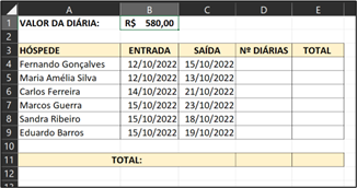 - A coluna TOTAL deve ser calculada como: Nº DIÁRIAS * VALOR DA DIÁRIA. Atenção à fórmula! Lembre-se que o endereço da célula que contém o valor da diária (célula B1) deve ser sempre o mesmo em todas as células.