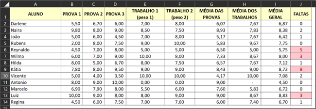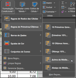 - A coluna FALTAS deve ser formatada para mostrar em destaque os alunos que têm faltas acima da média. Selecione a faixa de células J2:J14 e, na guia Página Inicial, grupo Estilos, Regras de Primeiros/Últimos, selecione Acima de Média: