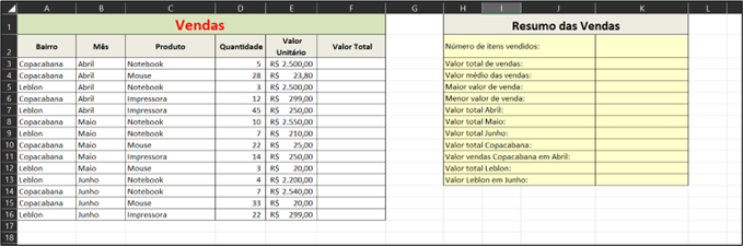 - Calcule a coluna Valor Total multiplicando Quantidade por Valor Unitário.