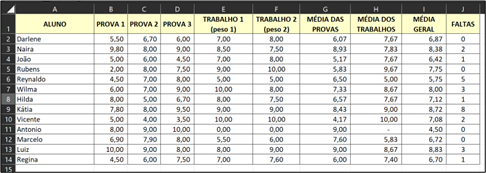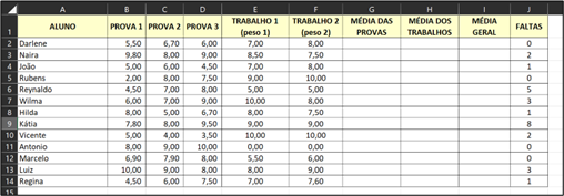 - A coluna MÉDIA DOS TRABALHOS corresponde ao cálculo da média ponderada entre as notas obtidas nos trabalhos, ou seja, a média é calculada considerando o peso de cada nota, ou seja, devemos somar os produtos de cada nota pelo seu respectivo peso e dividir o resultado pela soma dos pesos.