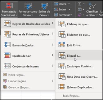 - Selecione a opção Regras de Realce das Células e, a seguir, É Igual a...