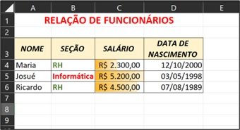 Para testar o funcionamento da Formatação Condicional, modifique os dados das colunas SEÇÃO e SALÁRIO.