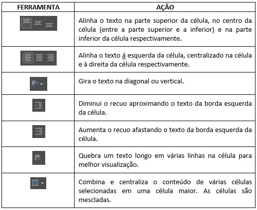 Nesse grupo temos ferramentas para alinhamento dos dados nas células.