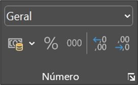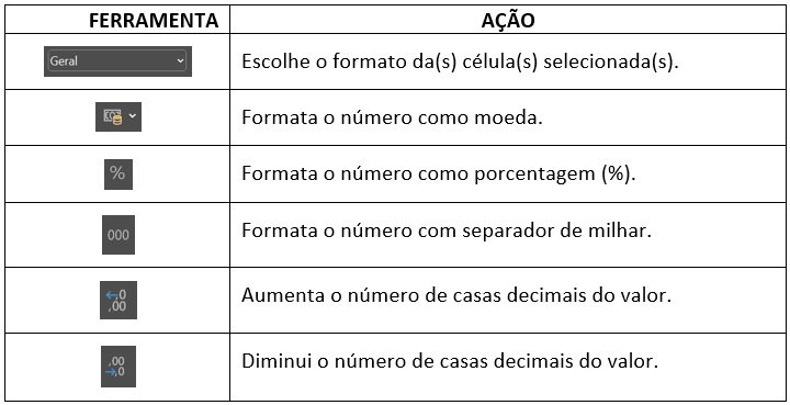 Nesse grupo temos ferramentas para formatação dos dados nas células como número, moeda, data, hora, porcentagem e outros.