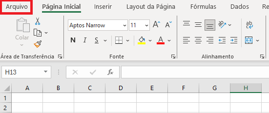 Neste primeiro cenário temos que a guia de planilhas sumiu totalmente. Isso acontece porque o Excel não está mais mostrando ela e para fazer com que o Excel volte a mostrar a aba de planilhas, será necessário ir na guia guia “Arquivo”.