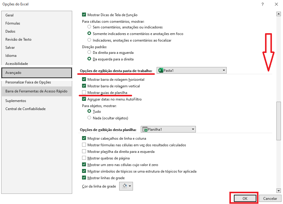 E depois role a barra de rolagem vertical para baixo, até que apareça a seção “Opções de exibição desta pasta de trabalho” e selecione “Mostrar guias de planilha” e clique em “OK”.