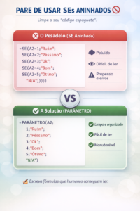 Se você tem planilhas antigas cheias de SE aninhado, vale a pena migrar para PARÂMETRO.